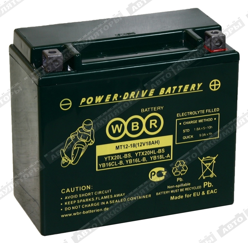 Герметизированные, выполненные по технологии AGM, необслуживаемые (MF) стартерные мотоциклетные свинцово-кислотные аккумуляторы WBR МТ12-18 обладают высоким качеством и надежностью. Они предназначены для запуска двигателя мотоциклов, скутеров, гидроциклов, квадроциклов, снегоходов и мотовездеходов. Батареи соответствуют техническим характеристикам и являются аналогом мотоциклетных аккумуляторных батарей YUASA моделей YTX20L-BS, YTX20HL-BS, YB16CL-B, YB16L-B и YB18L-A.