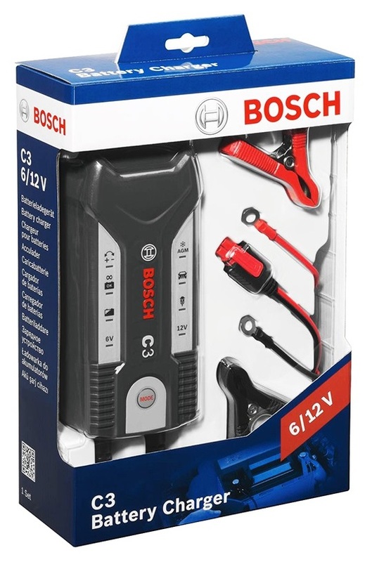 Автоматическое зарядное устройство BOSCH C3 предназначено для зарядки как обслуживаемых, так и необслуживаемых свинцово-кислотных аккумуляторов типа VRLA, используемых в легковых автомобилях; WET (с жидким электролитом), EFB, AGM и GEL. Оно рассчитано на зарядку 12В аккумуляторов емкостью от 14Ач до 120Ач и 6В аккумуляторов емкостью от 1,2Ач до 14Ач.